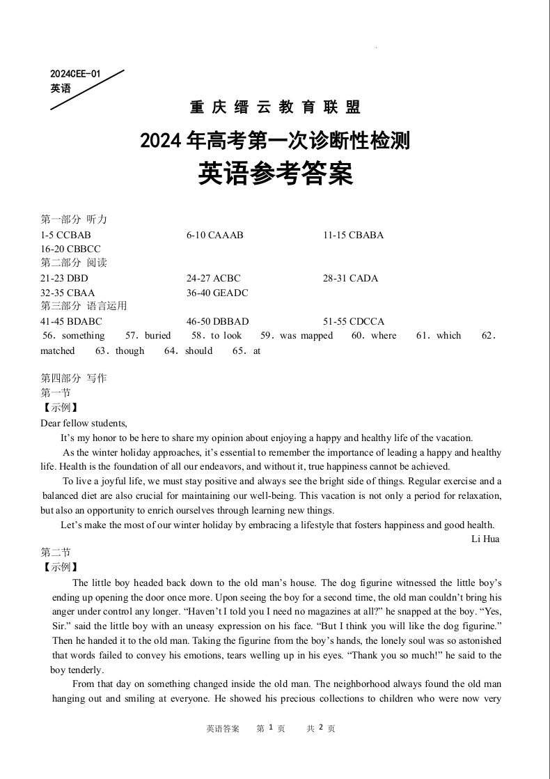 重庆缙云教育联盟2024届高三高考第一次诊断性检测(一模)英语答案
