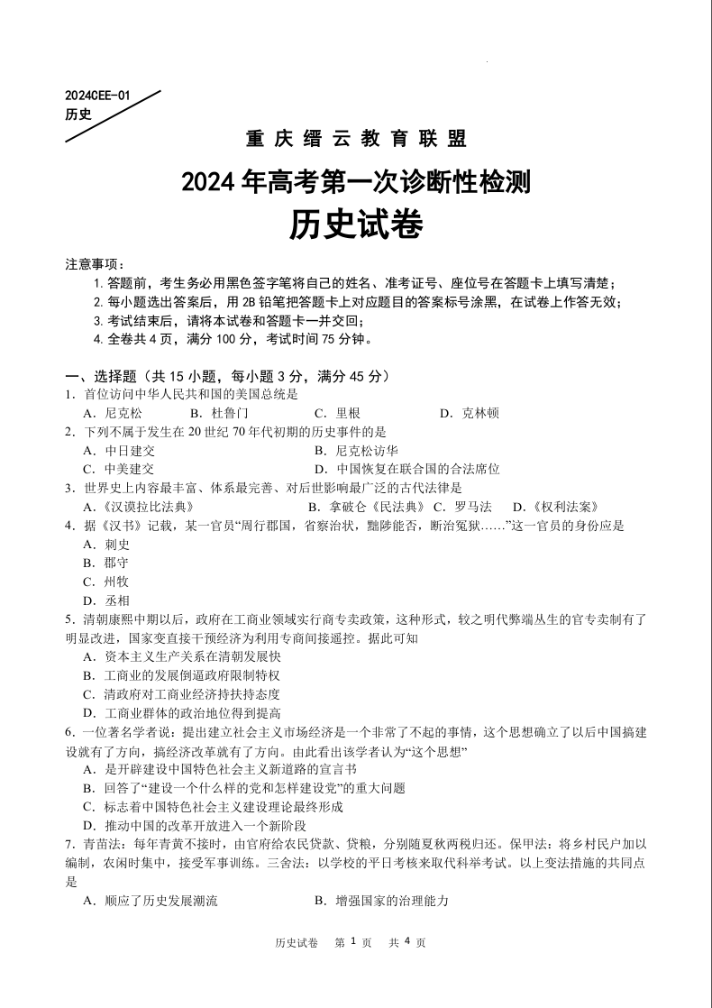 重庆缙云教育联盟2024届高三高考第一次诊断性检测(一模)历史