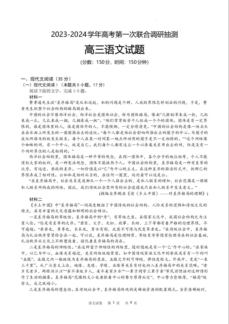 重庆市乌江2024届新高考协作体高三上学期第一次联合调研抽测(一模)语文