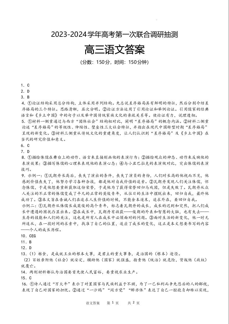 重庆市乌江2024届新高考协作体高三上学期第一次联合调研抽测(一模)语文答案