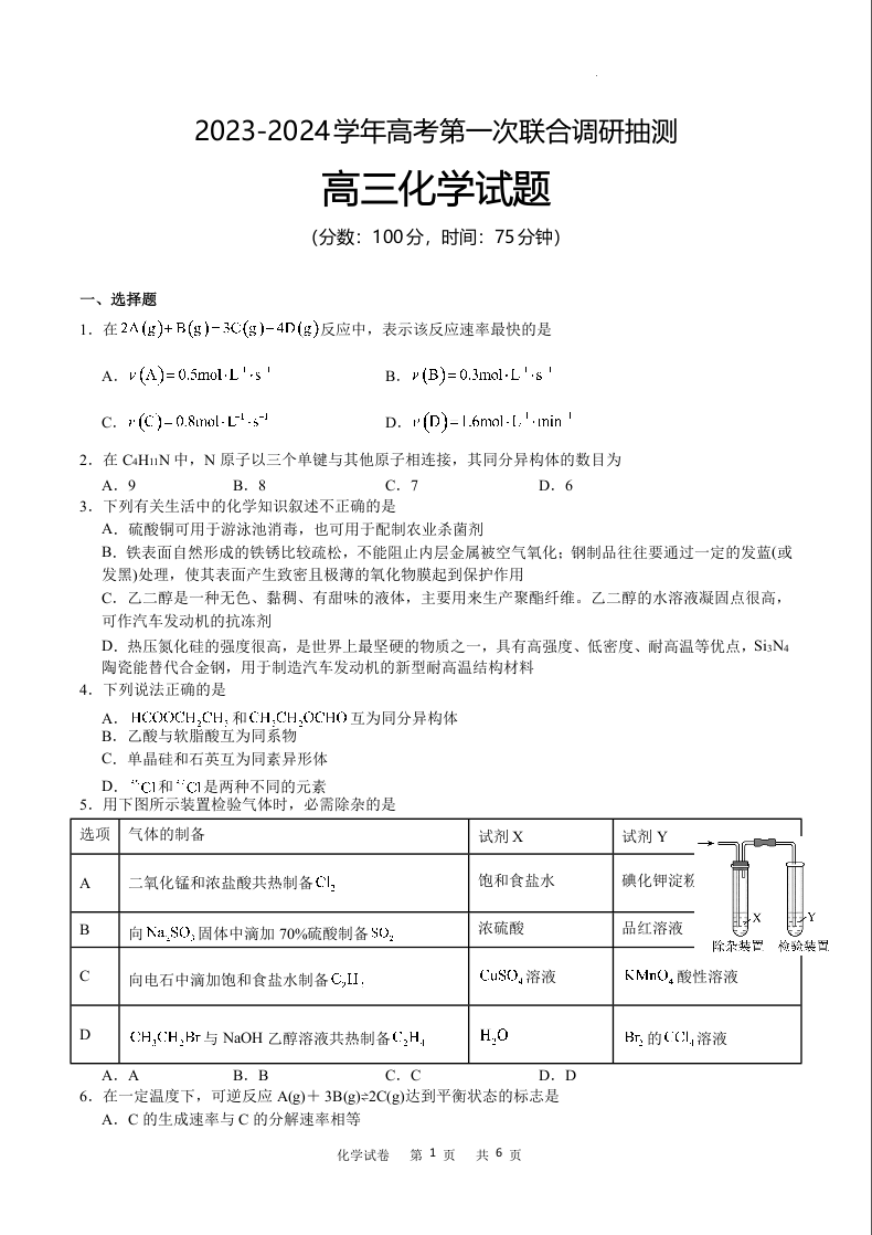 重庆市乌江2024届新高考协作体高三上学期第一次联合调研抽测(一模)化学