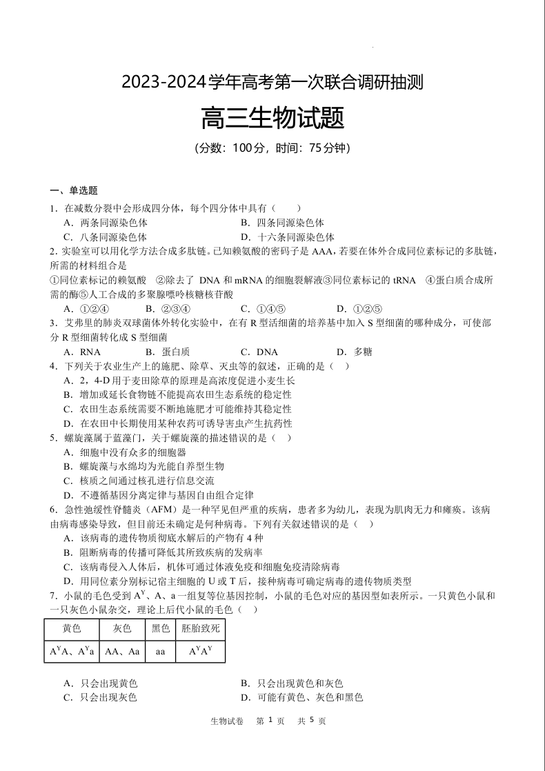 重庆市乌江2024届新高考协作体高三上学期第一次联合调研抽测(一模)生物