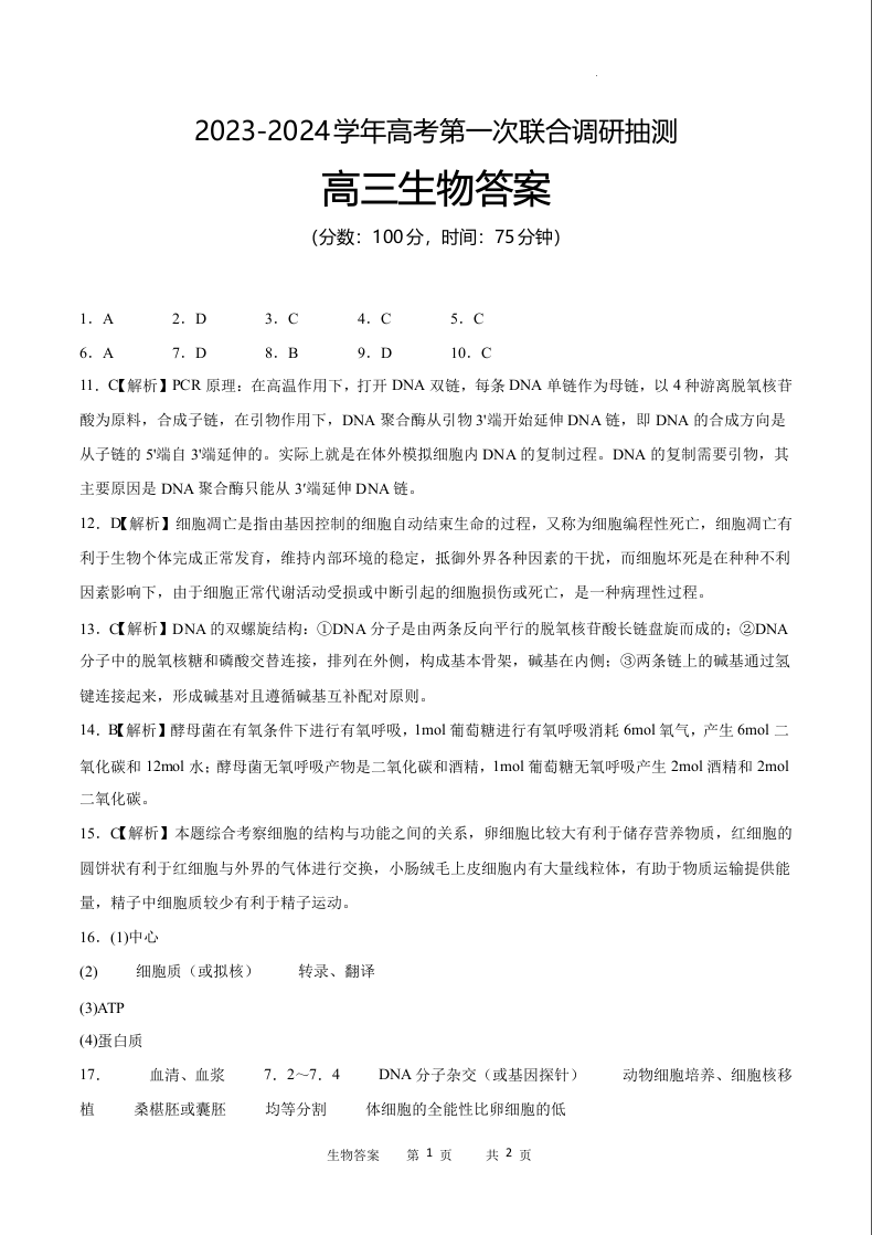 重庆市乌江2024届新高考协作体高三上学期第一次联合调研抽测(一模)生物答案