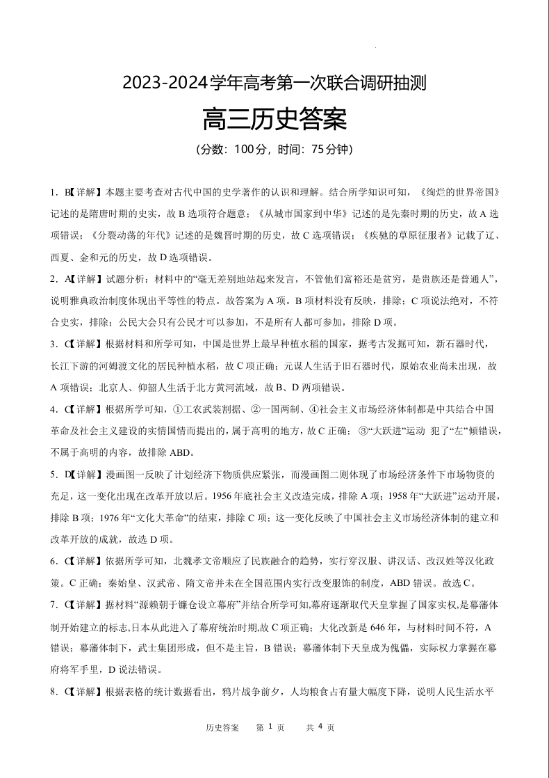 重庆市乌江2024届新高考协作体高三上学期第一次联合调研抽测(一模)历史答案