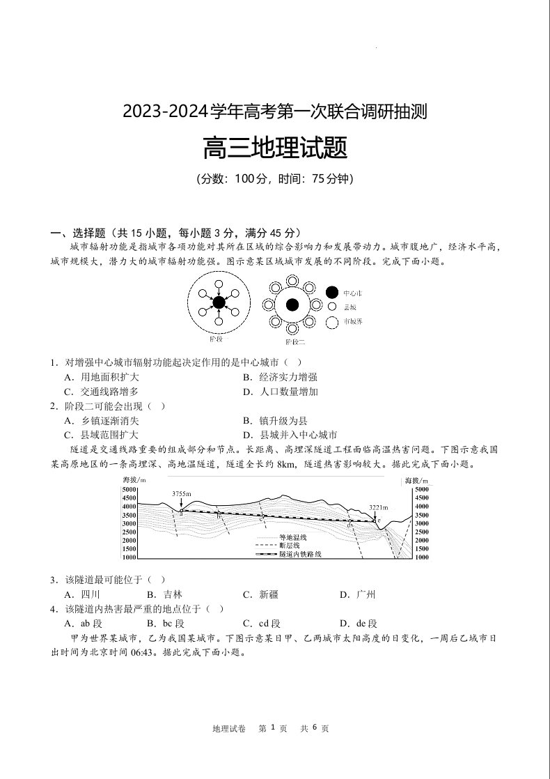 重庆市乌江2024届新高考协作体高三上学期第一次联合调研抽测(一模)地理