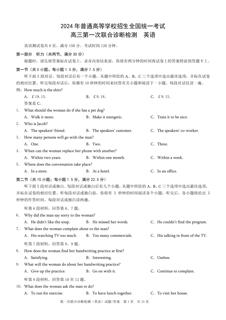 重庆一诊康德卷2024年普通高等学校招生全国统一考试高三第一次联合诊断检测英语