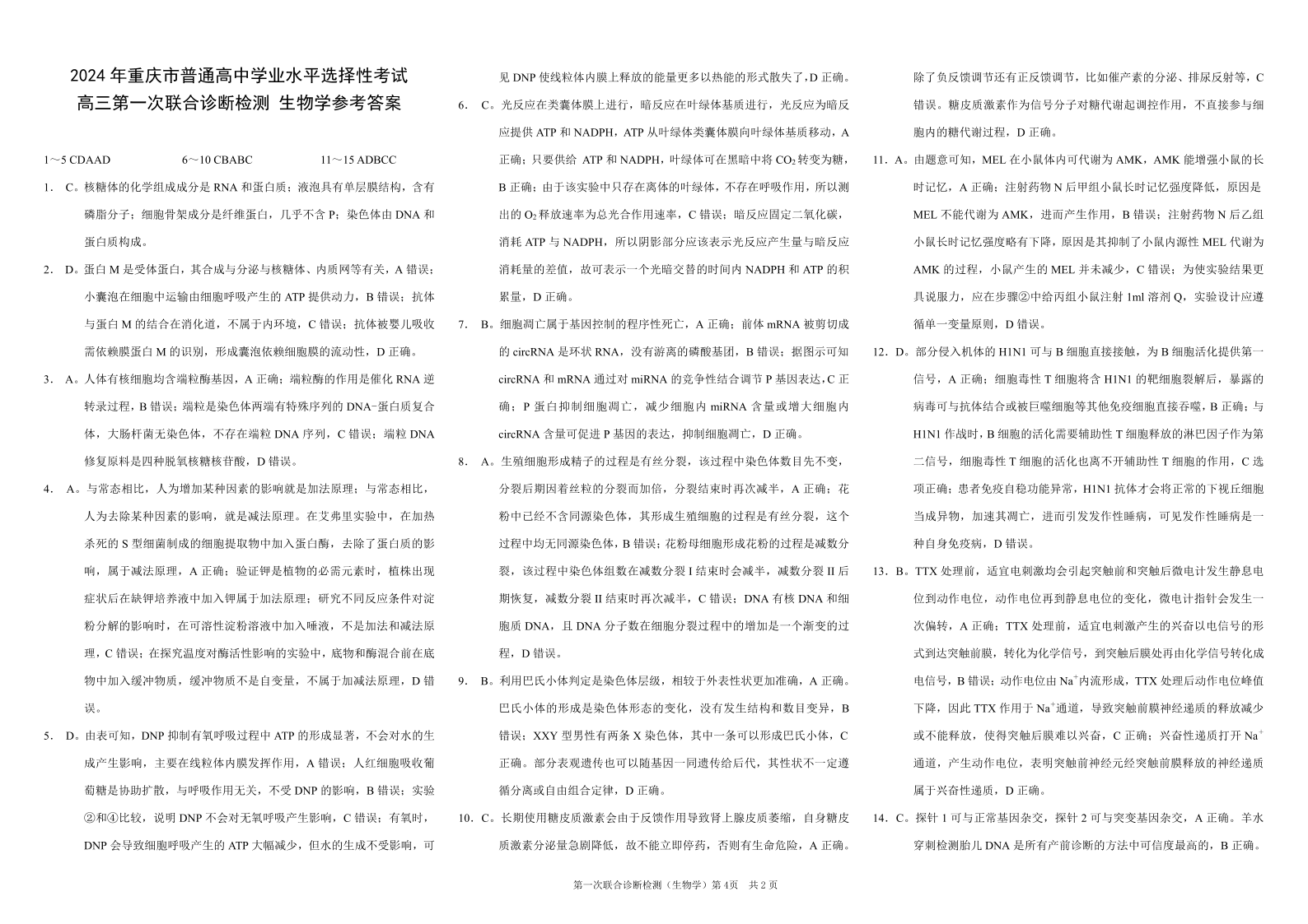重庆一诊康德卷2024年普通高等学校招生全国统一考试高三第一次联合诊断检测生物答案
