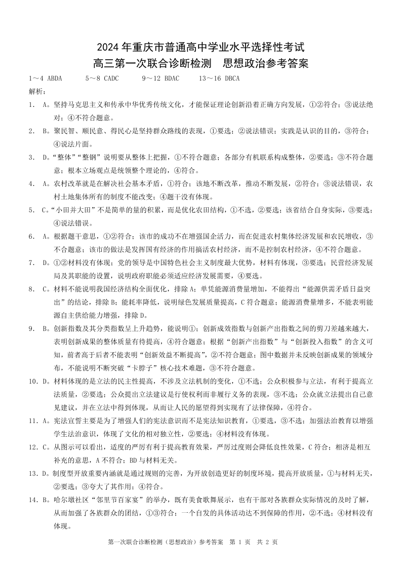 重庆一诊康德卷2024年普通高等学校招生全国统一考试高三第一次联合诊断检测政治答案