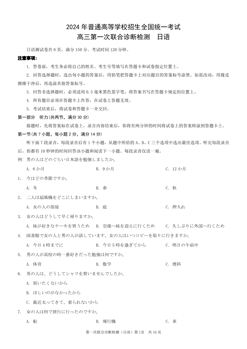 重庆一诊康德卷2024年普通高等学校招生全国统一考试高三第一次联合诊断检测日语+答案