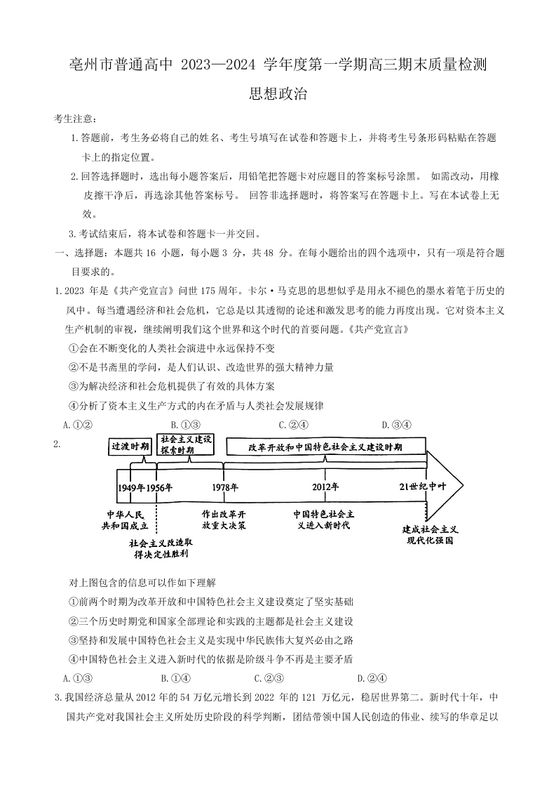 安徽省亳州市普通高中2024届高三上学期1月期末质量检测政治