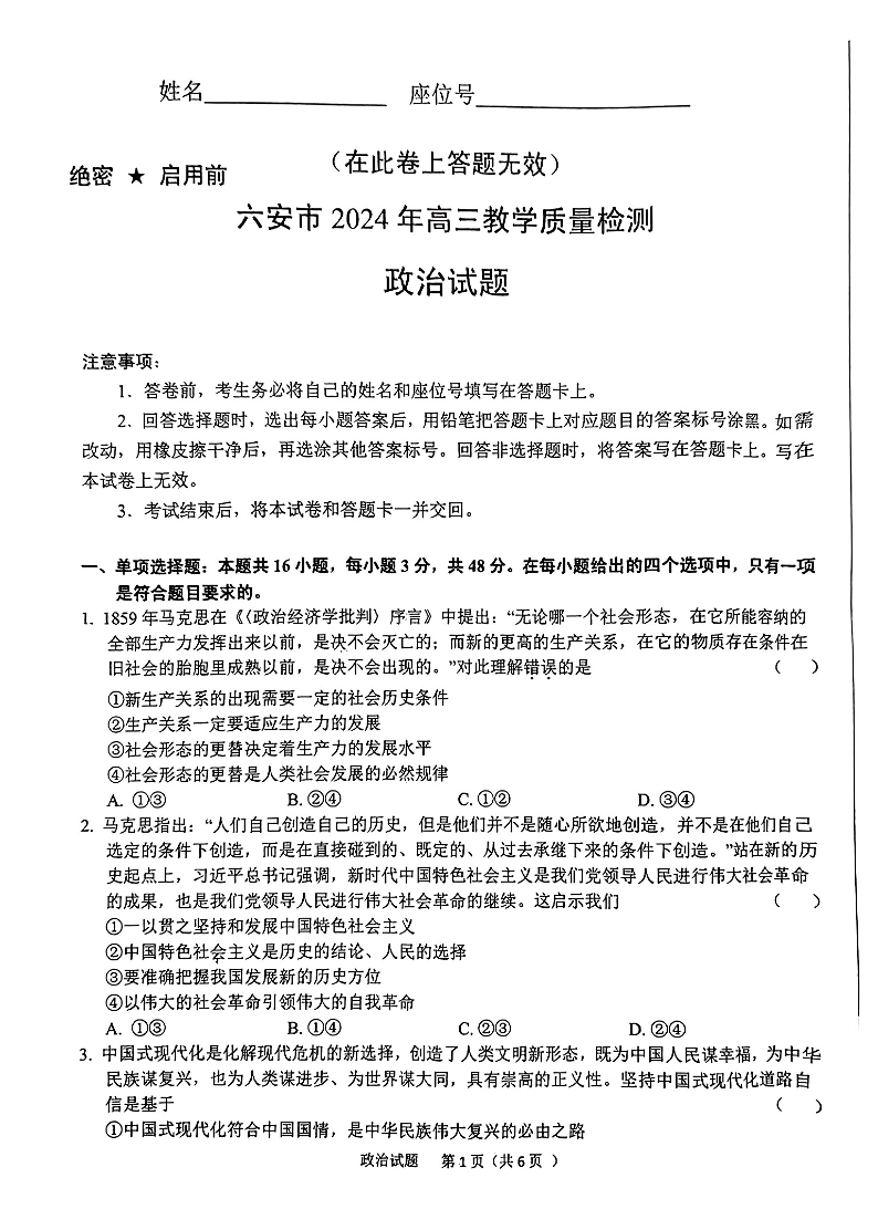 安徽省六安市2024届高三上学期期末教学质量检测政治