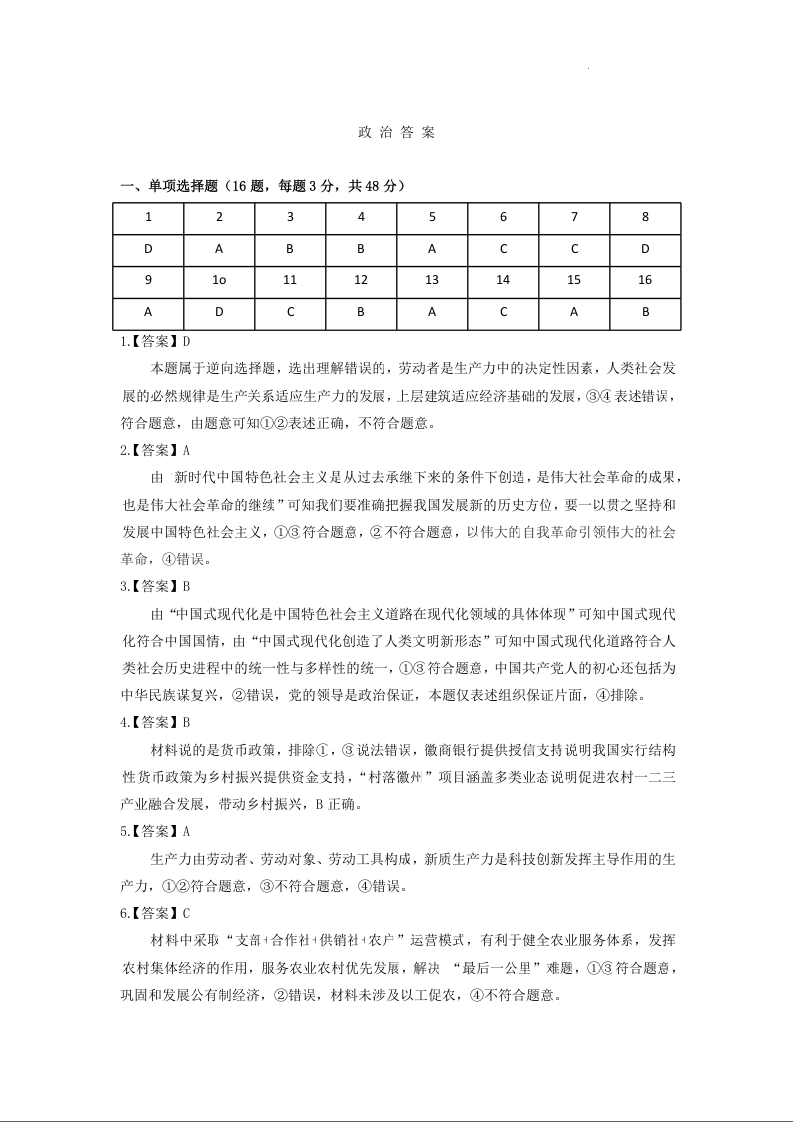 安徽省六安市2024届高三上学期期末教学质量检测政治答案