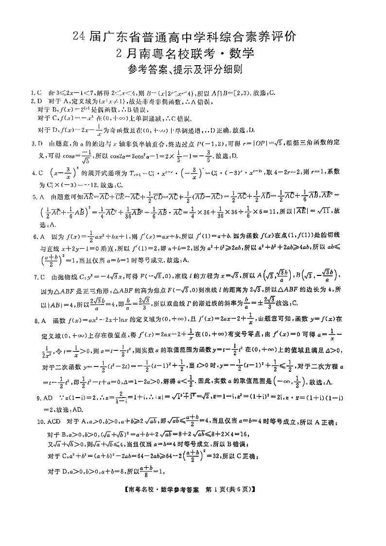 广东省南粤名校2024届高三下学期2月联考数学答案