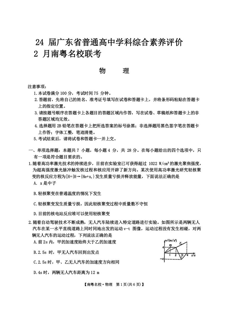 广东省南粤名校2024届高三下学期2月联考物理+答案