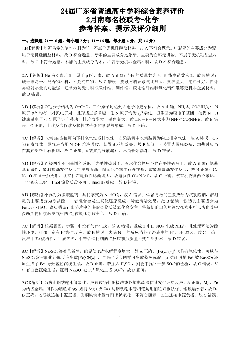广东省南粤名校2024届高三下学期2月联考化学答案