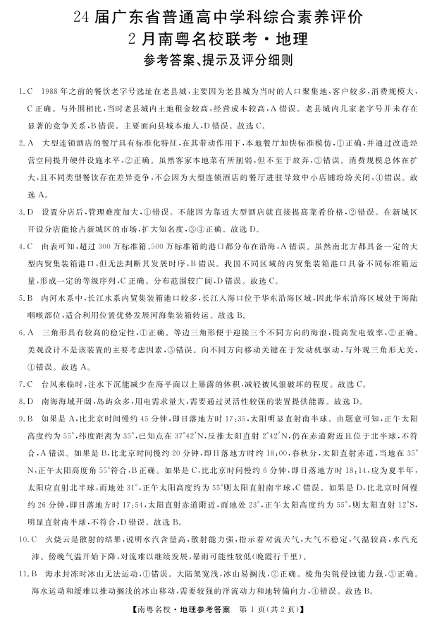 广东省南粤名校2024届高三下学期2月联考地理答案
