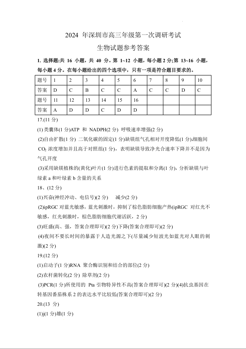 广东省深圳市2024届高三一模考试生物答案