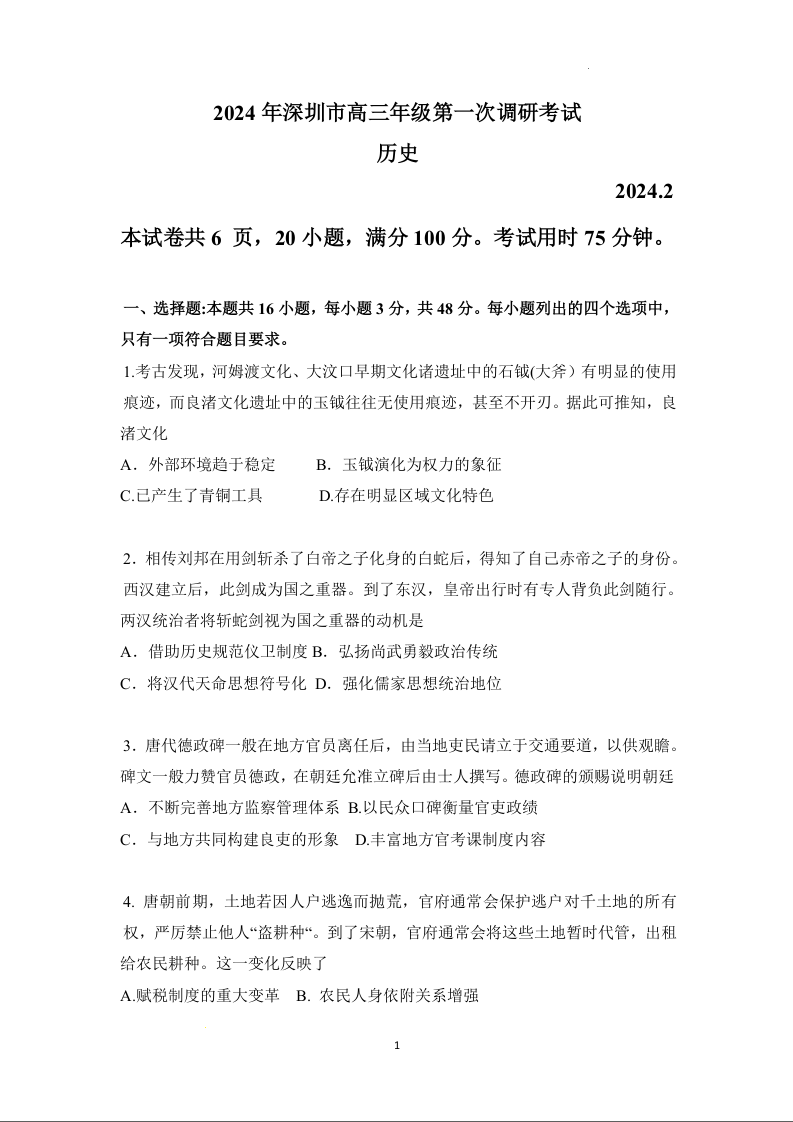 广东省深圳市2024届高三一模考试历史