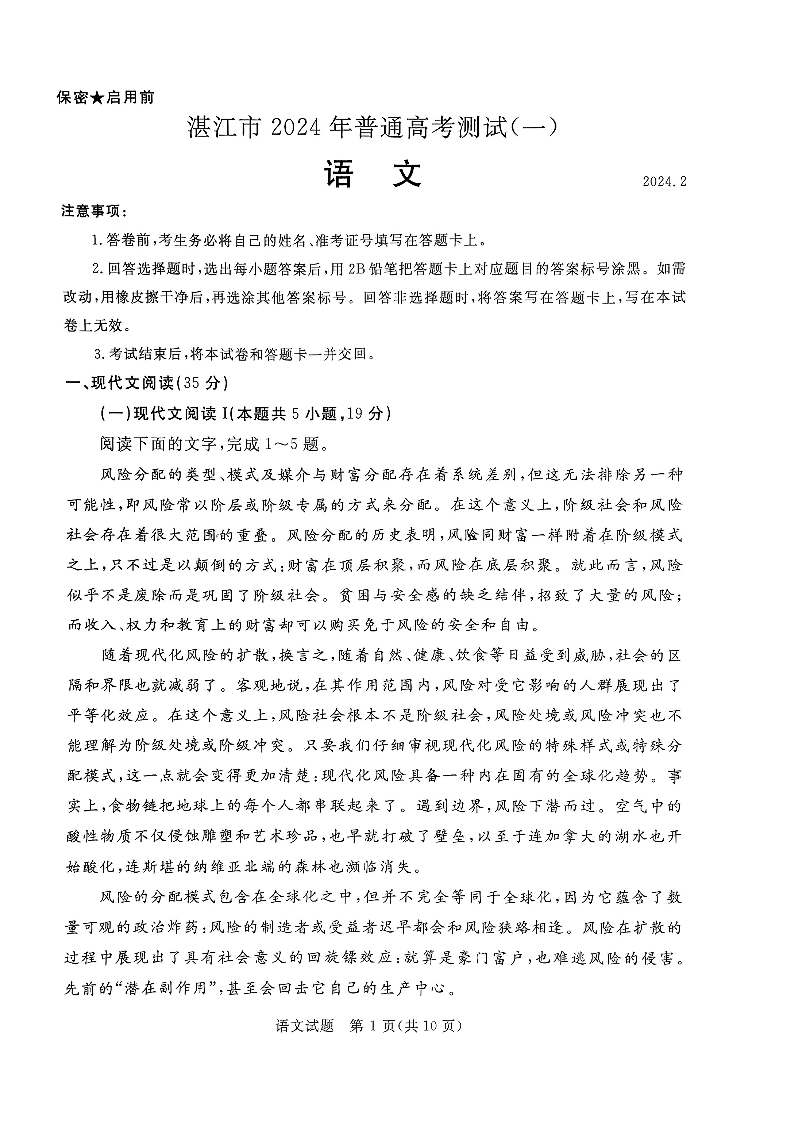 广东省湛江市2024届普通高考第一次模拟考试(湛江一模)语文