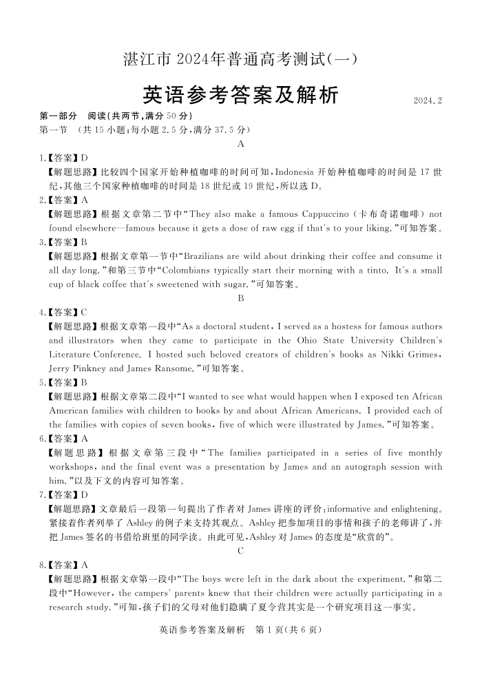 广东省湛江市2024届普通高考第一次模拟考试(湛江一模)英语答案