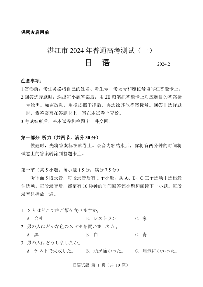 广东省湛江市2024届普通高考第一次模拟考试(湛江一模)日语