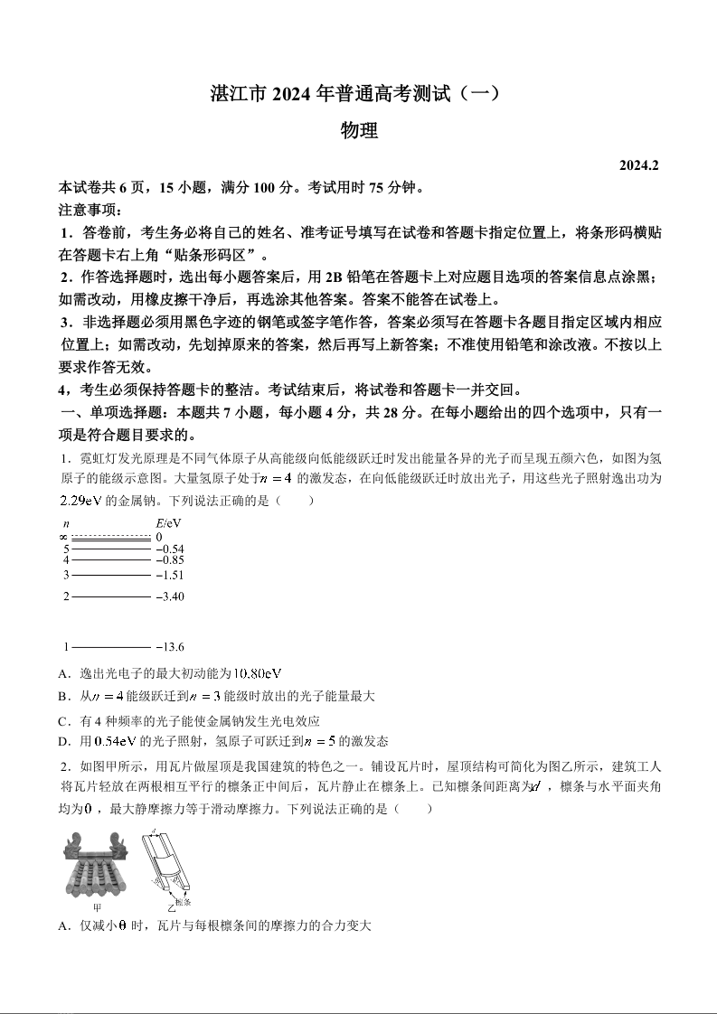 广东省湛江市2024届普通高考第一次模拟考试(湛江一模)物理+答案