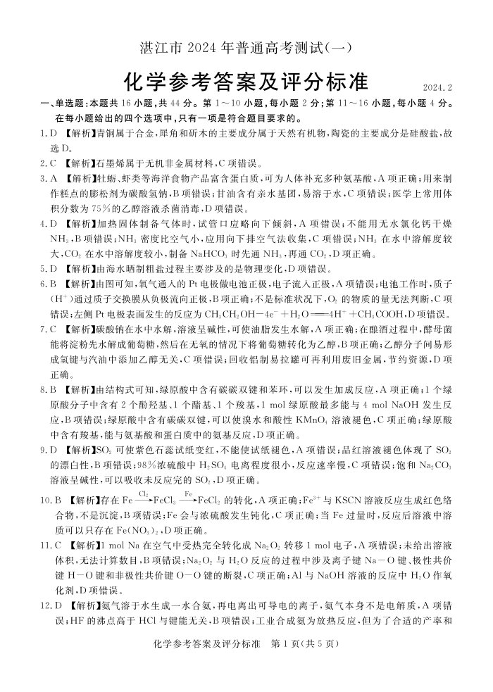 广东省湛江市2024届普通高考第一次模拟考试(湛江一模)化学答案