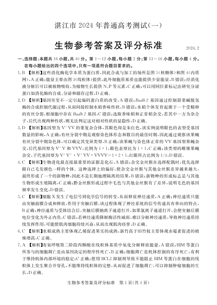 广东省湛江市2024届普通高考第一次模拟考试(湛江一模)生物答案