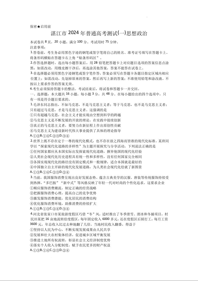 广东省湛江市2024届普通高考第一次模拟考试(湛江一模)政治+答案
