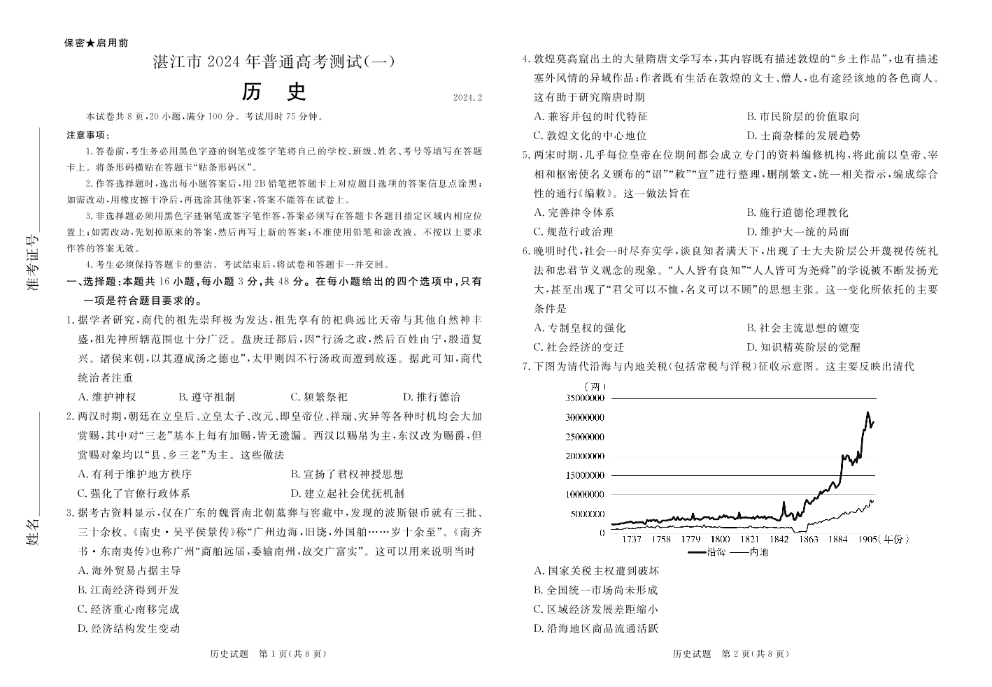 广东省湛江市2024届普通高考第一次模拟考试(湛江一模)历史