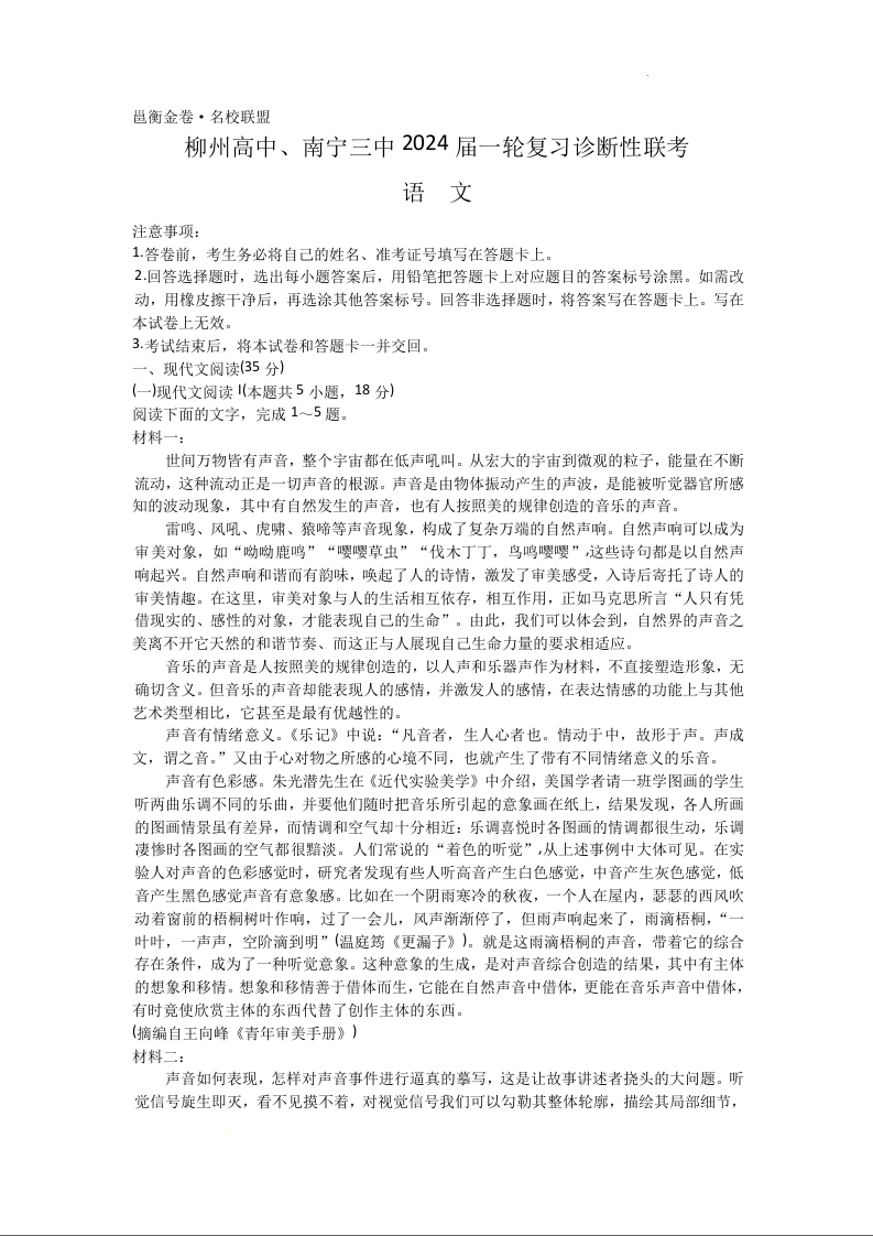 广西2024届邕衡金卷柳州高中、南宁三中高三一轮复习诊断性联考语文