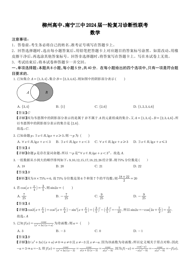 广西2024届邕衡金卷柳州高中、南宁三中高三一轮复习诊断性联考数学(解析版)
