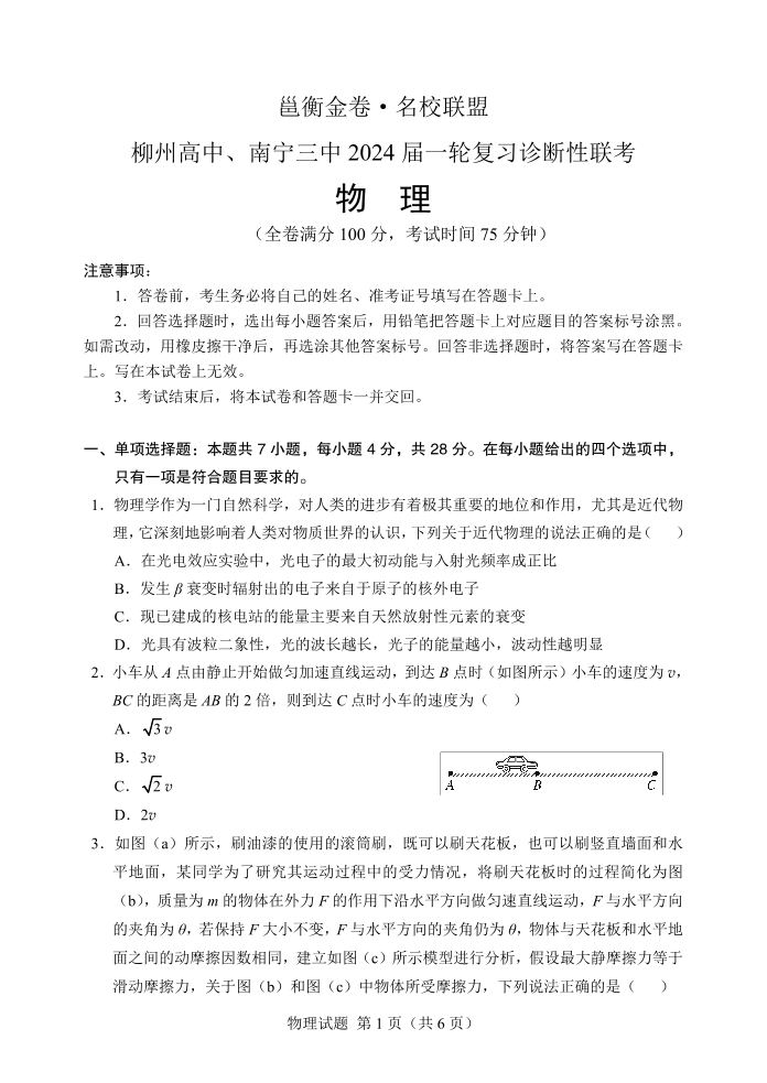 广西2024届邕衡金卷柳州高中、南宁三中高三一轮复习诊断性联考物理