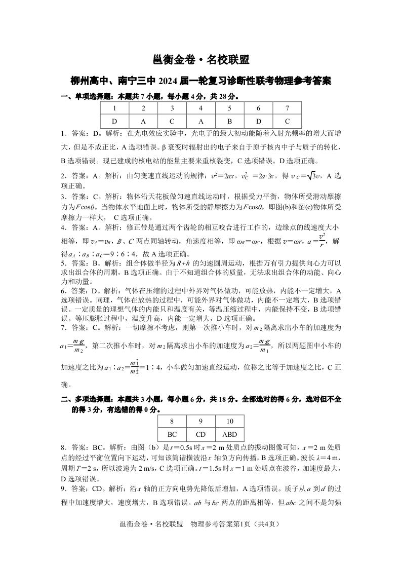 广西2024届邕衡金卷柳州高中、南宁三中高三一轮复习诊断性联考物理答案