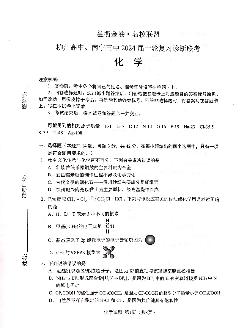 广西2024届邕衡金卷柳州高中、南宁三中高三一轮复习诊断性联考化学