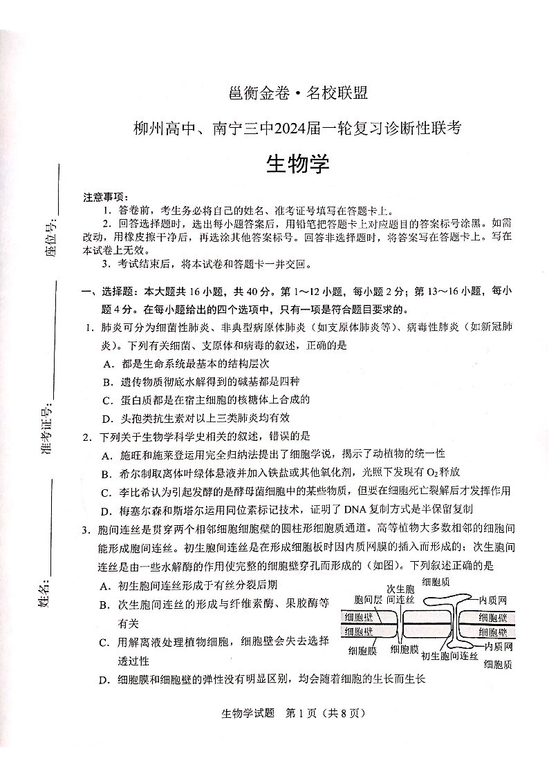 广西2024届邕衡金卷柳州高中、南宁三中高三一轮复习诊断性联考生物