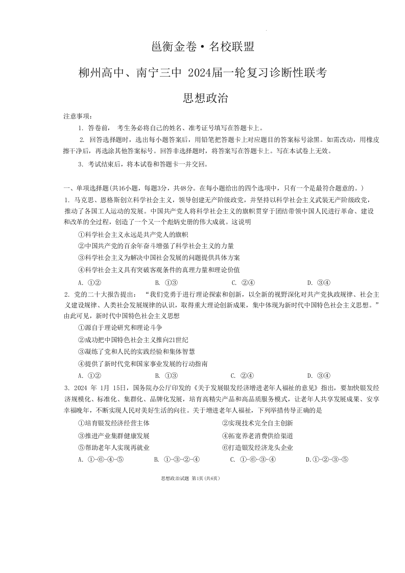 广西2024届邕衡金卷柳州高中、南宁三中高三一轮复习诊断性联考政治