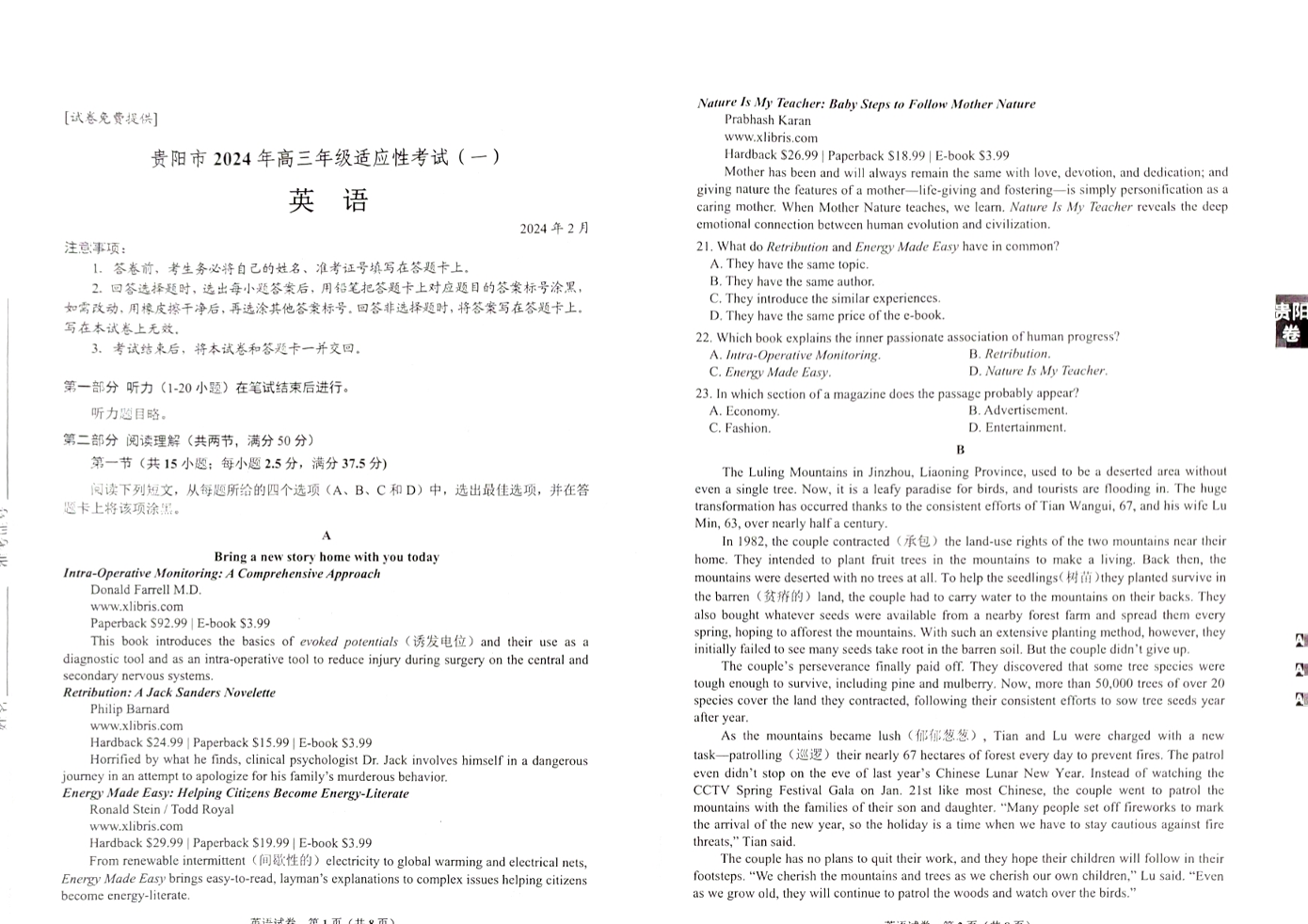 贵州省贵阳市2024届高三年级适应性考试(一)英语