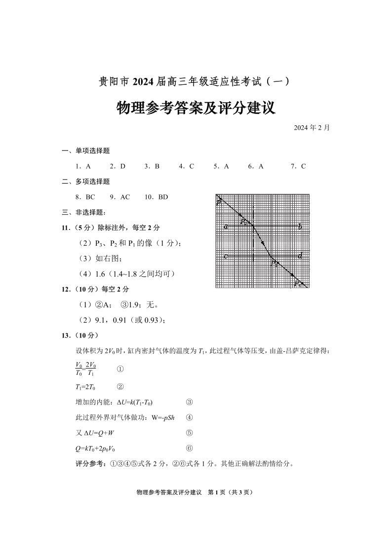 贵州省贵阳市2024届高三年级适应性考试(一)物理答案