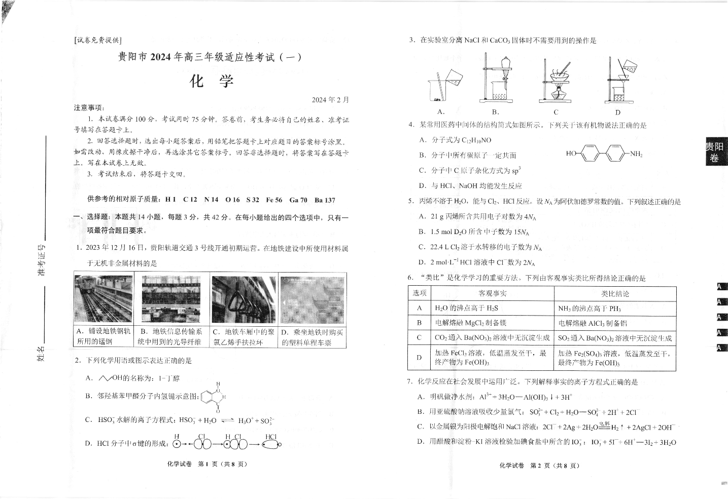 贵州省贵阳市2024届高三年级适应性考试(一)化学