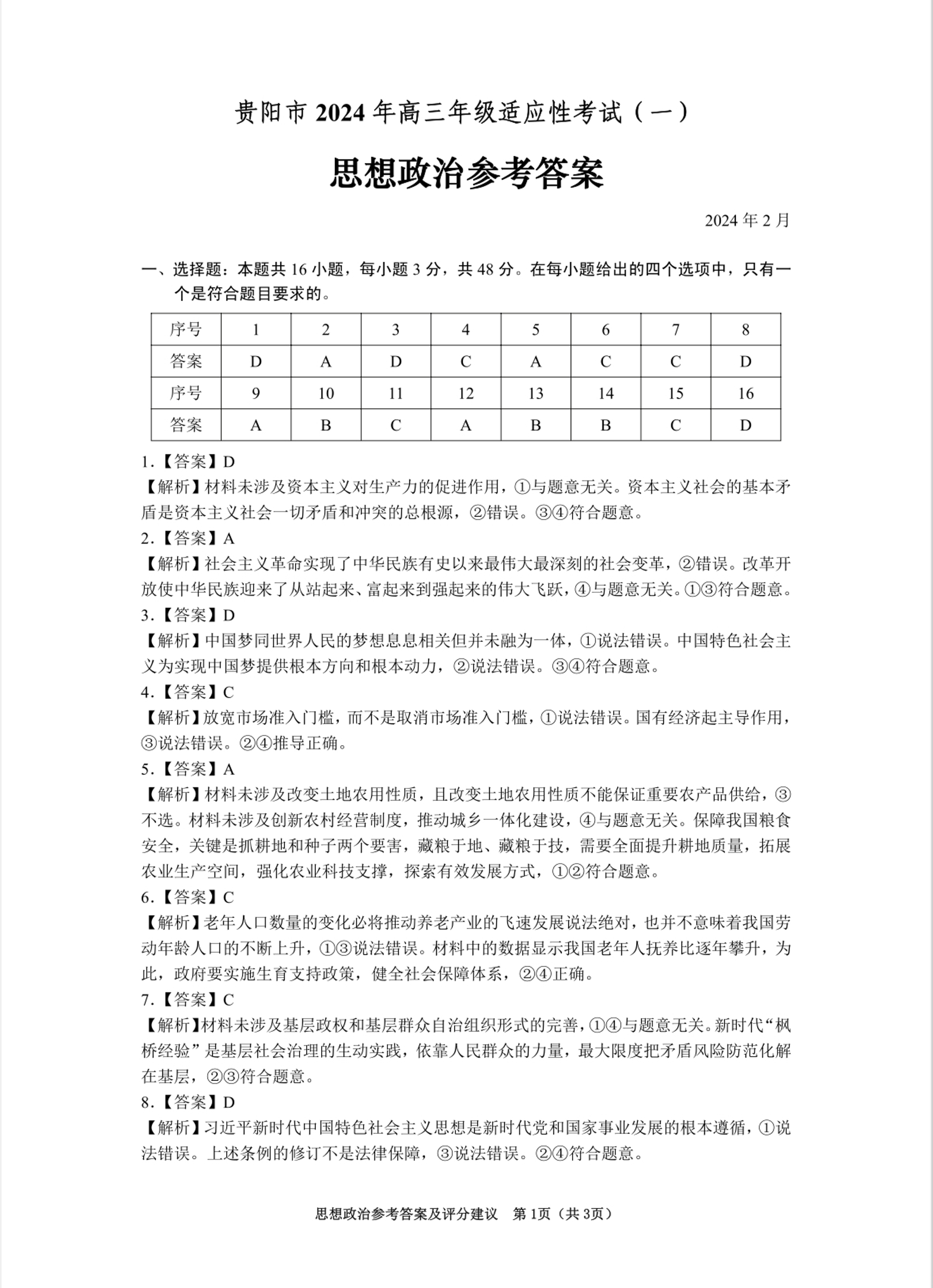 贵州省贵阳市2024届高三年级适应性考试(一)政治答案