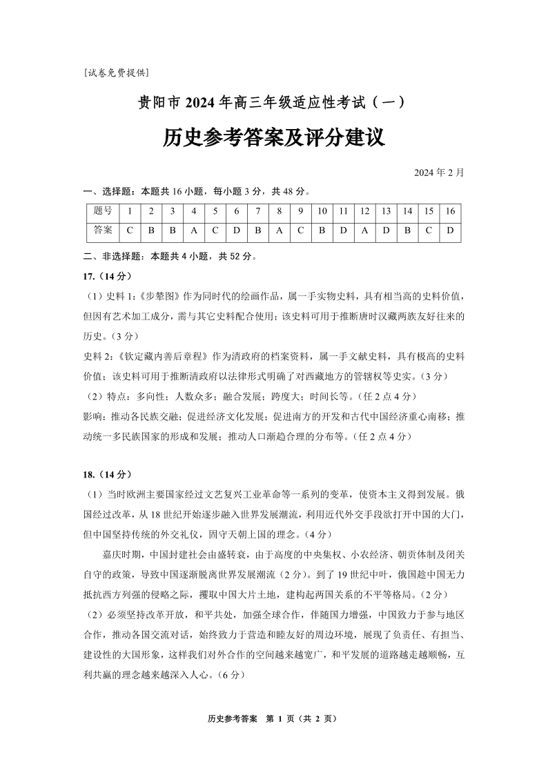 贵州省贵阳市2024届高三年级适应性考试(一)历史答案