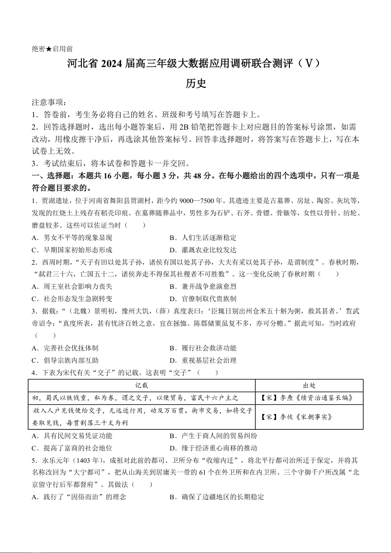 河北省大数据应用调研联合测评2024届高三下学期2月月考历史+答案