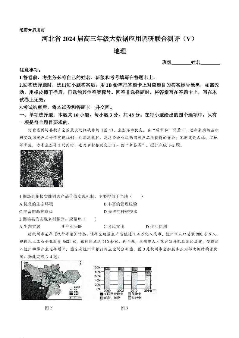 河北省大数据应用调研联合测评2024届高三下学期2月月考地理+答案