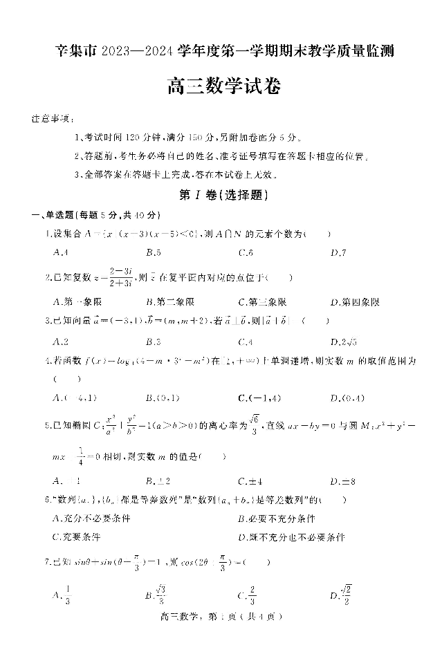 河北省石家庄市辛集市2024届高三上学期2月期末数学