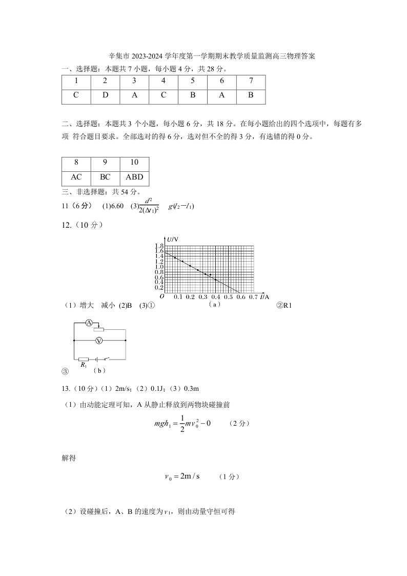 河北省石家庄市辛集市2024届高三上学期2月期末物理答案