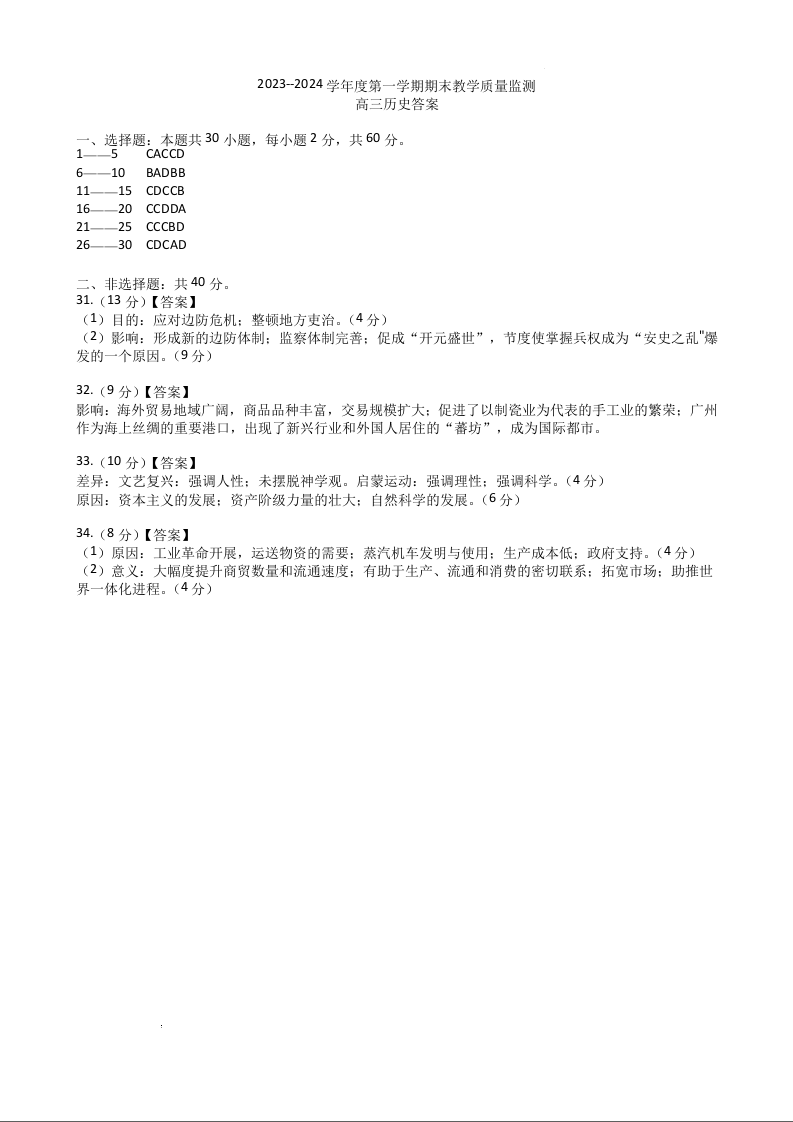 河北省石家庄市辛集市2024届高三上学期2月期末历史答案