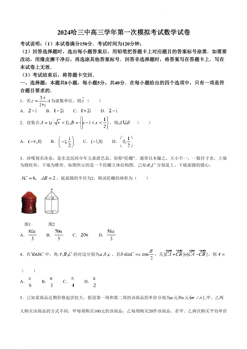 黑龙江省哈尔滨市2024届第三中学校高三下学期第一次模拟考试数学
