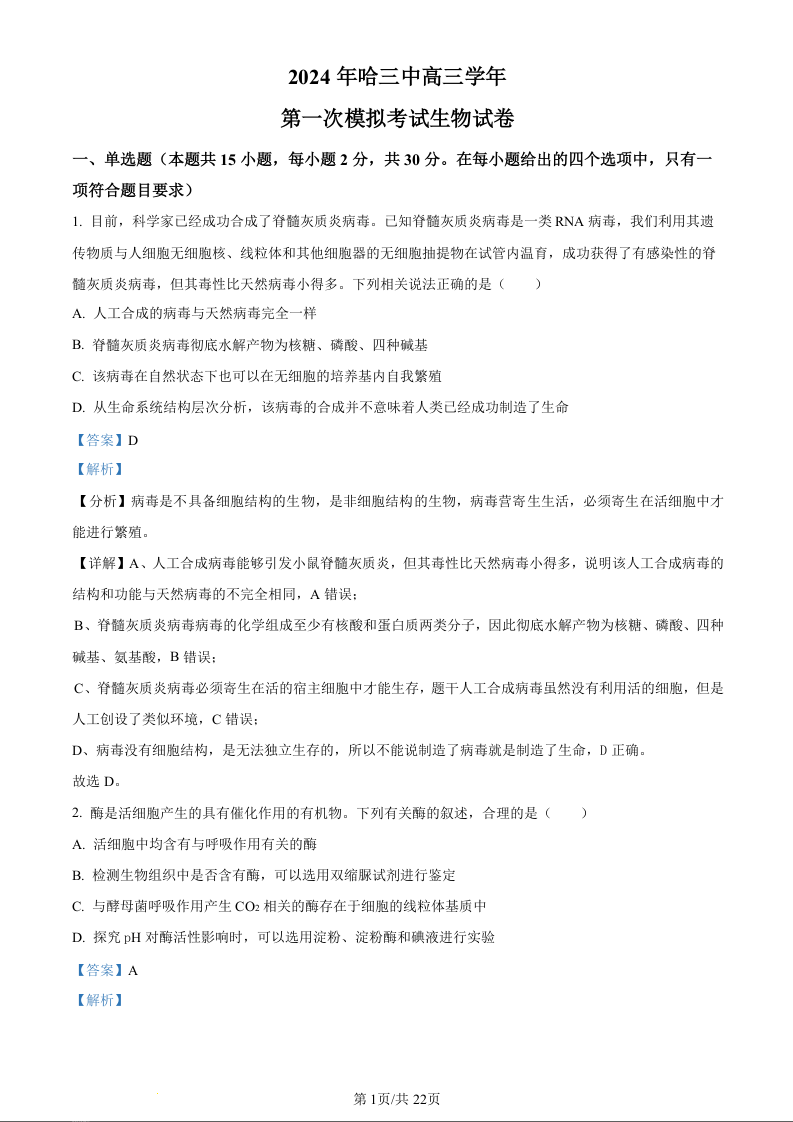 黑龙江省哈尔滨市2024届第三中学校高三下学期第一次模拟考试生物(精品解析版)