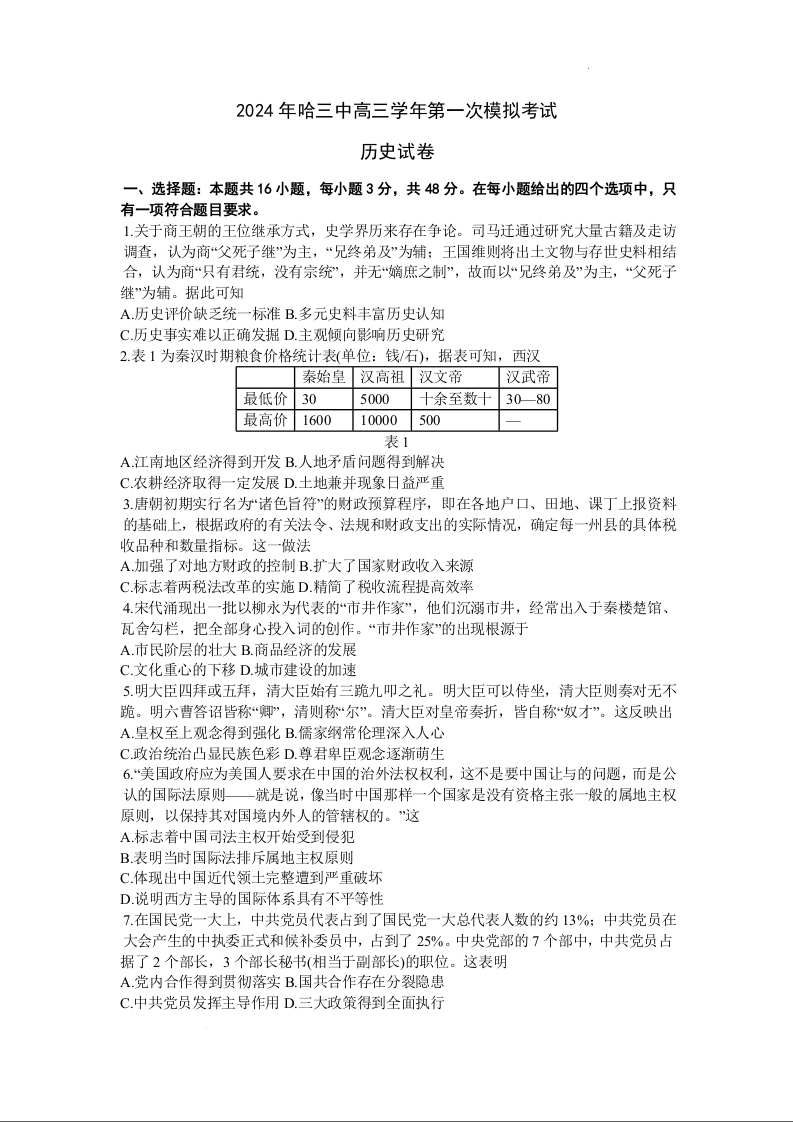 黑龙江省哈尔滨市2024届第三中学校高三下学期第一次模拟考试历史